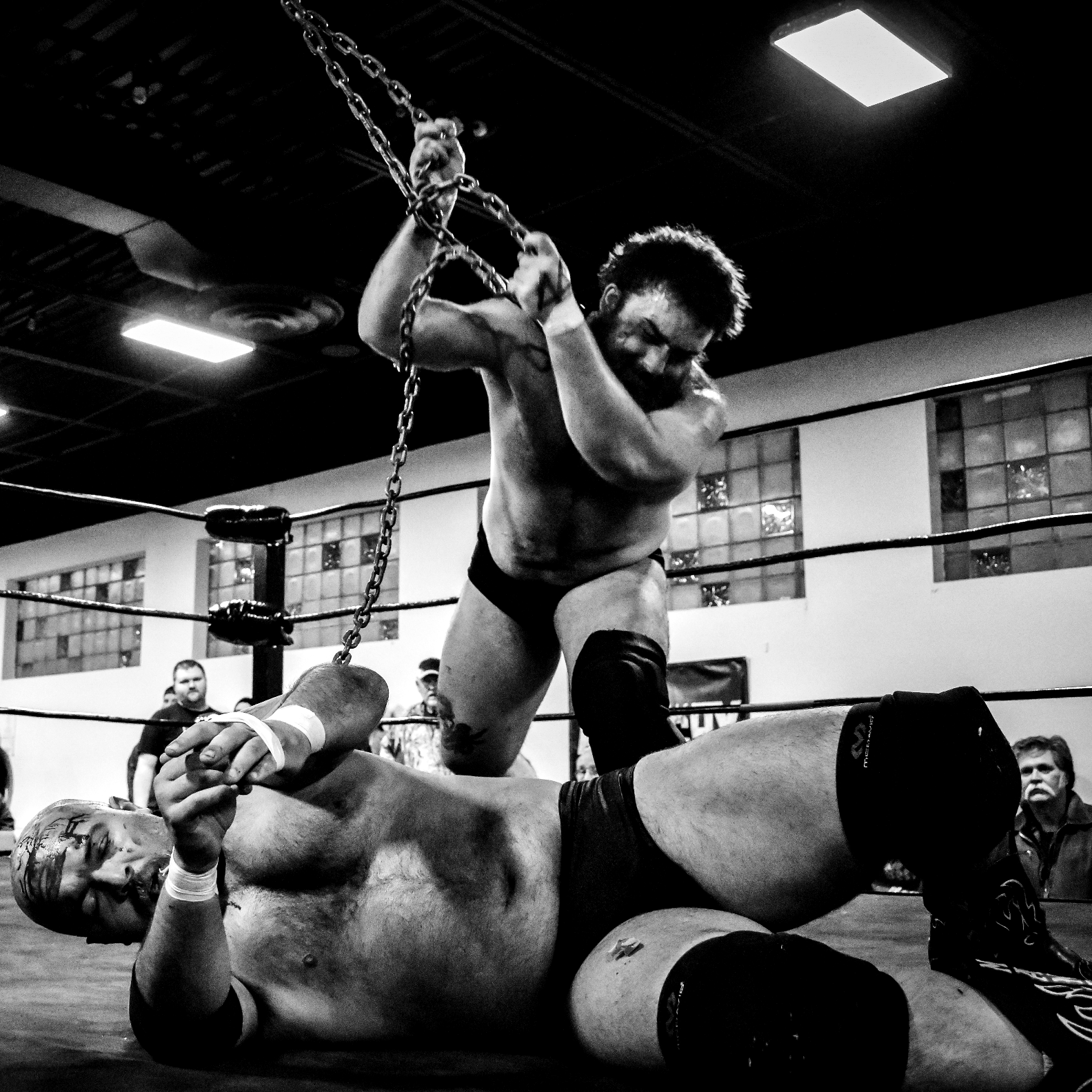 In the ring, we're on equal ground, both landing punches with the chain wrapped around our fists. Manders rakes my eyes and hits his lariat.
