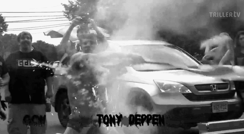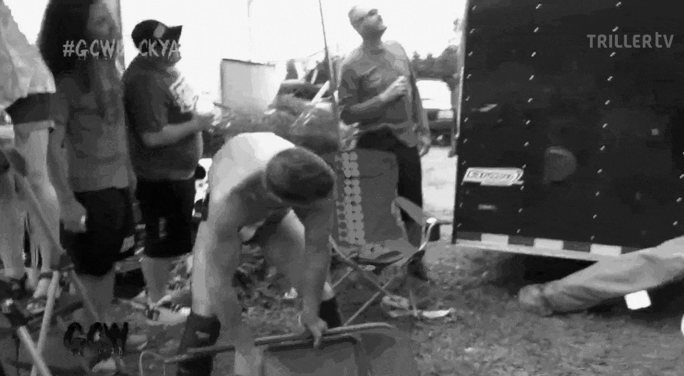 With a severe lack of sleep and caffeine coursing through my veins, I take a breath, step back, and attempt a Shooting Star Press from the trailer to Deppen below. He nails me with a chairshot as I rotate and land inches away from going head-first into a cinder block.