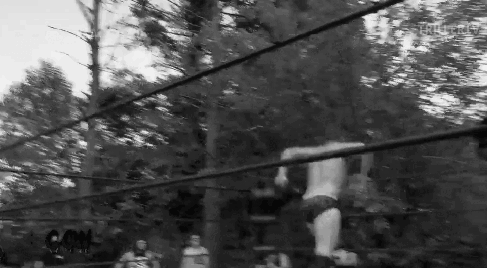 I place Deppen on a door set up across two tables on the floor. Well, the grass. I gather myself, run the ropes, and dive onto Deppen with a picture-perfect 630 from the ring to the floor.